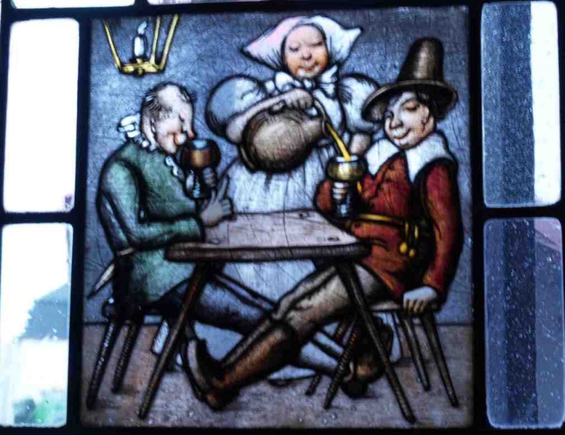Neben dem Bild über der Theke befinden sich im Gastraum mehrere Fensterbilder, die in die bleiverglasten Fenster eingelassen sind. Einige dieser Bilder wurden in den 1930er Jahren, die restlichen als Ersatz für Kriegsverluste Ende der 1960er / Anfang 1970er Jahre hergestellt.